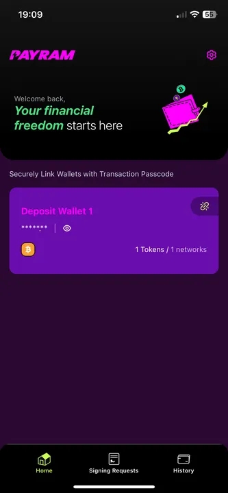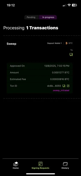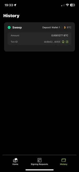 Once you have successfully linked the BTC wallet, you are ready to sweep funds from your BTC deposit wallets to your cold wallet. Go to the Signing Requests tab, where you will see the funds that are ready to be swept. This section will list the deposit addresses where you have received payments, allowing you to sweep them into your cold wallet.
