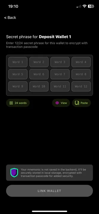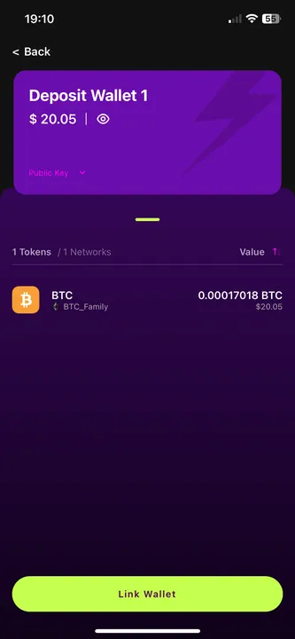Now you will see the wallet that you attached during the BTC wallet configuration. You need to select this exact same account so it can be linked here. Click on the link icon, then click on the Link Wallet button. You will be asked to enter the seed phrase, so make sure you have the exact same seed phrase for the account you attached earlier when configuring the BTC wallet. After entering the seed phrase, click Link Wallet to complete the process.
