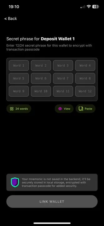 Note: The seed phrase will never be stored on any server. It is kept only on your local device storage and protected with encryption.