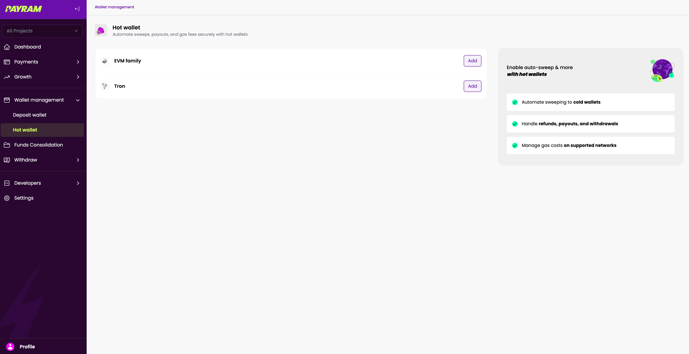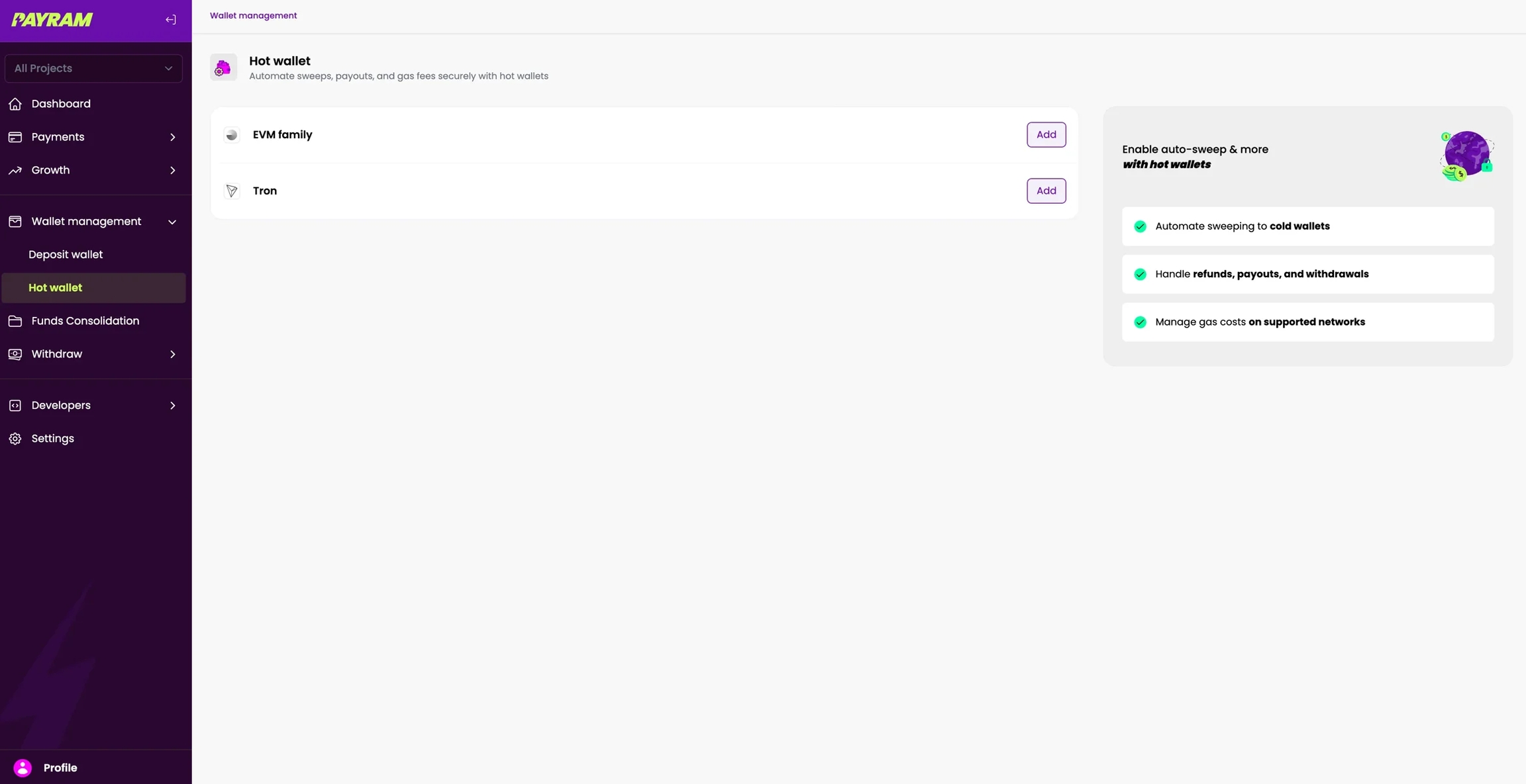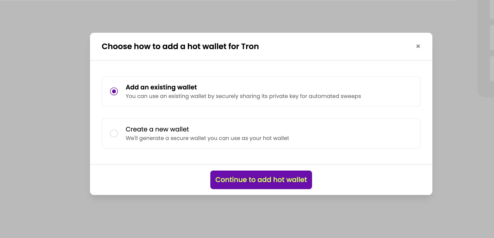 You have now set up the hot wallet for Tron. When you receive deposits on the Tron chain to your deposit addresses, this hot wallet pays the gas fees for sweeping funds to your cold wallet address.