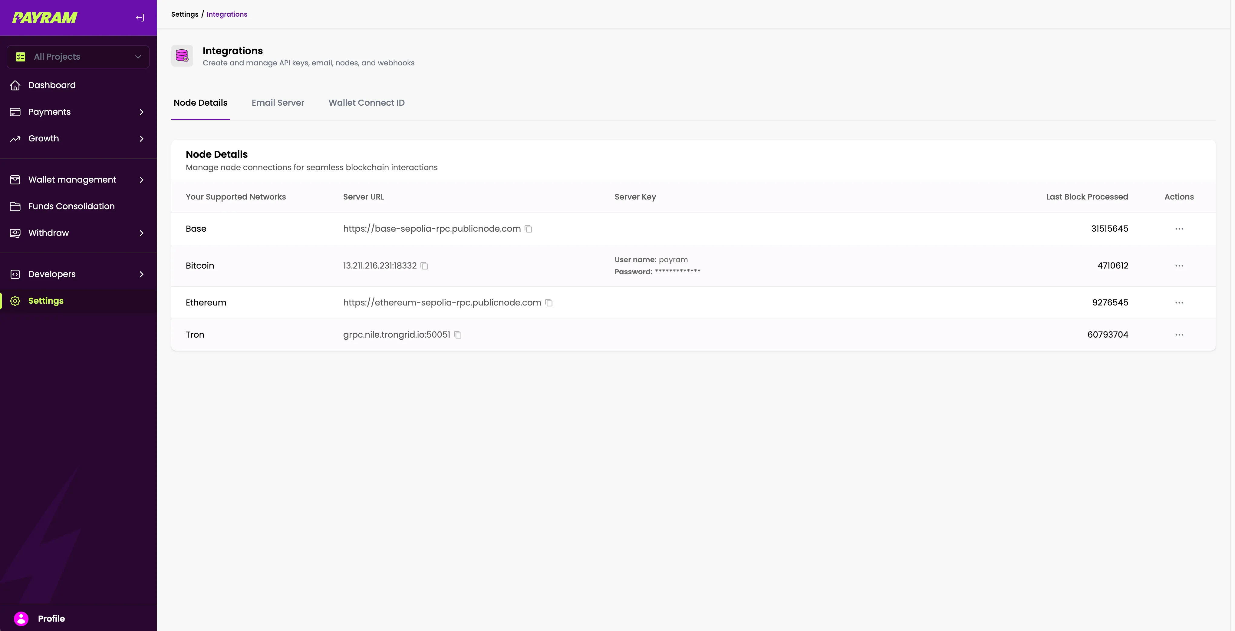 * Before accepting any payments, you need to configure the blockchain nodes based on the network you selected while installing PayRam. For example, if you chose mainnet, configure the mainnet nodes, and if you chose testnet, configure the testnet nodes accordingly.