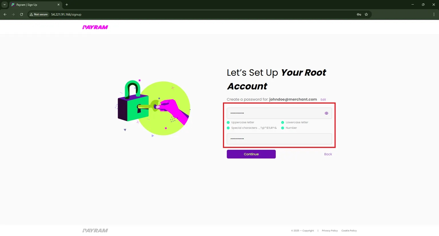 In this section, you’ll complete the initial setup for your root account, which serves as the main administrator account for your PayRam server. By the end, your root account will be ready to manage a